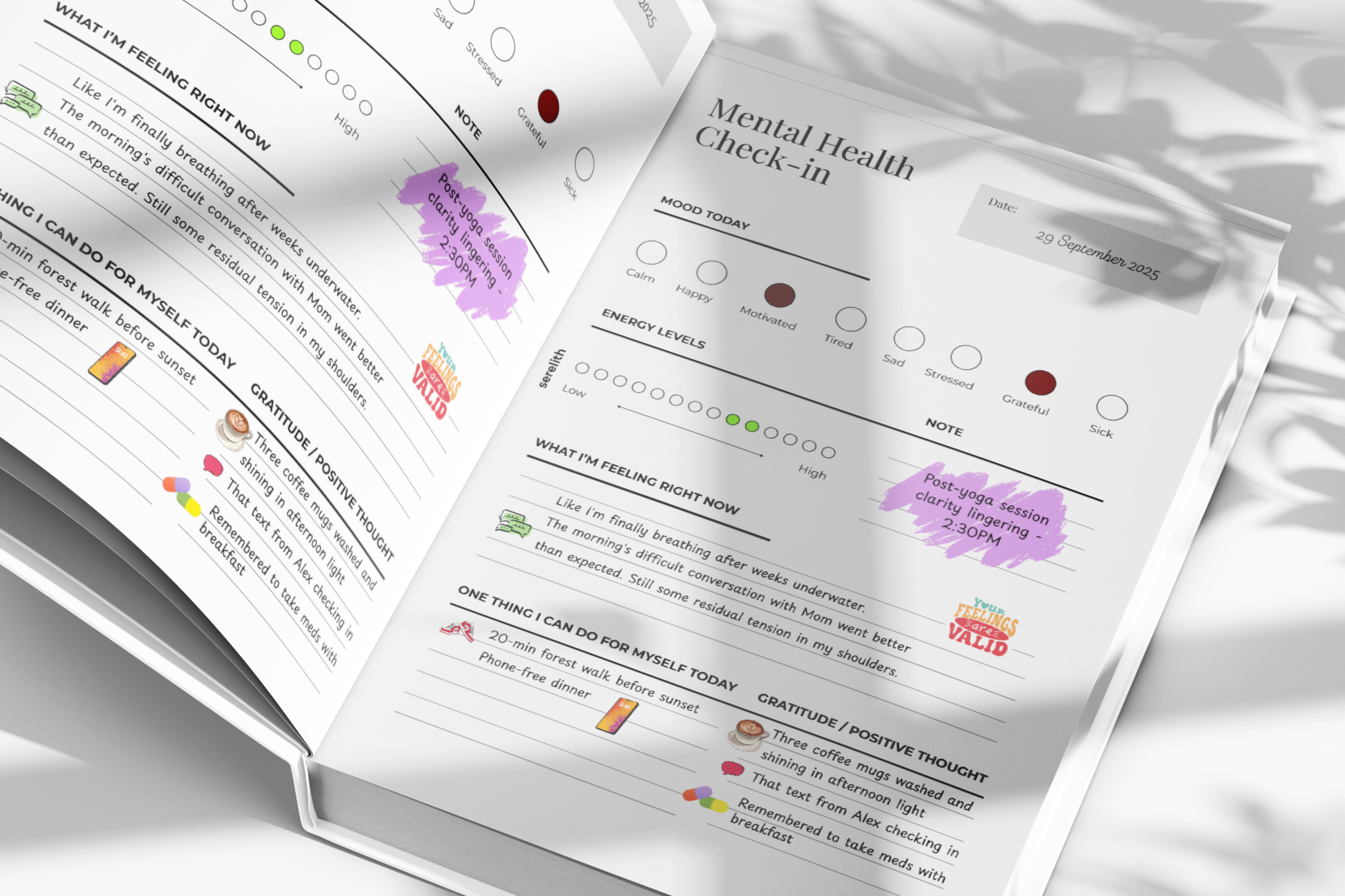 With guided prompts for mood, energy levels, gratitude, and positive thoughts, it creates a safe space for reflection while encouraging mindfulness and self-care.