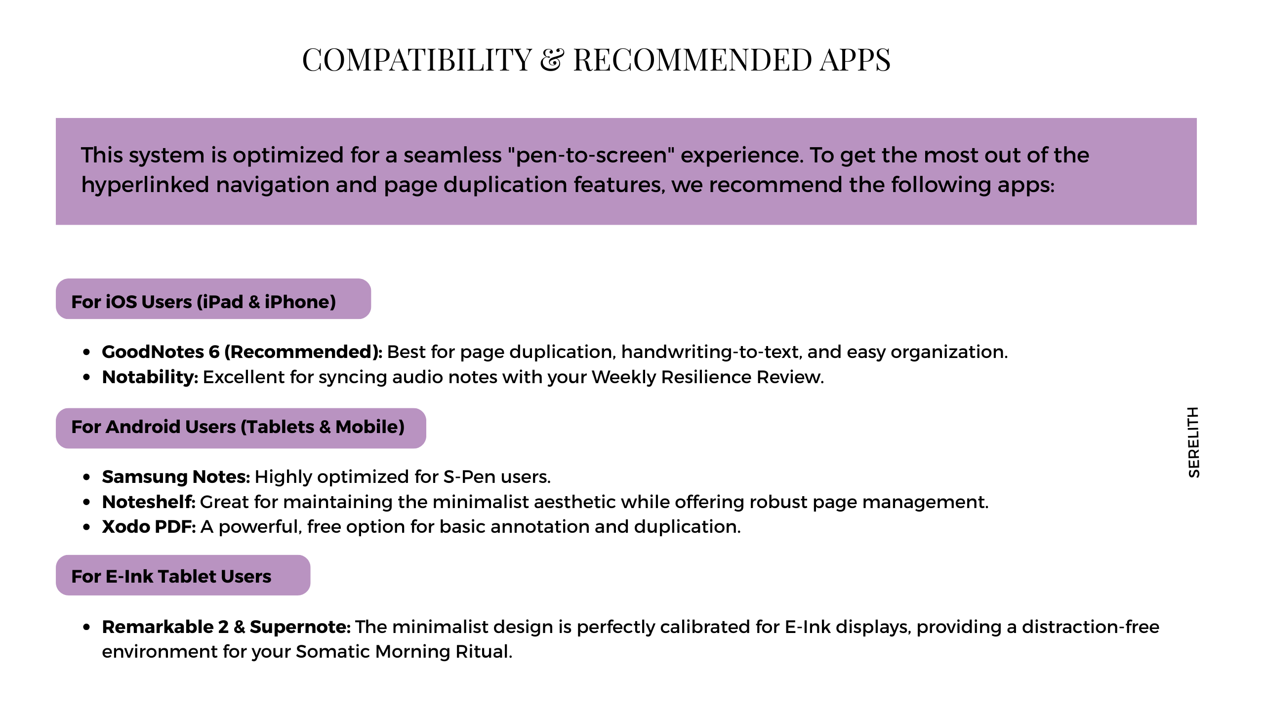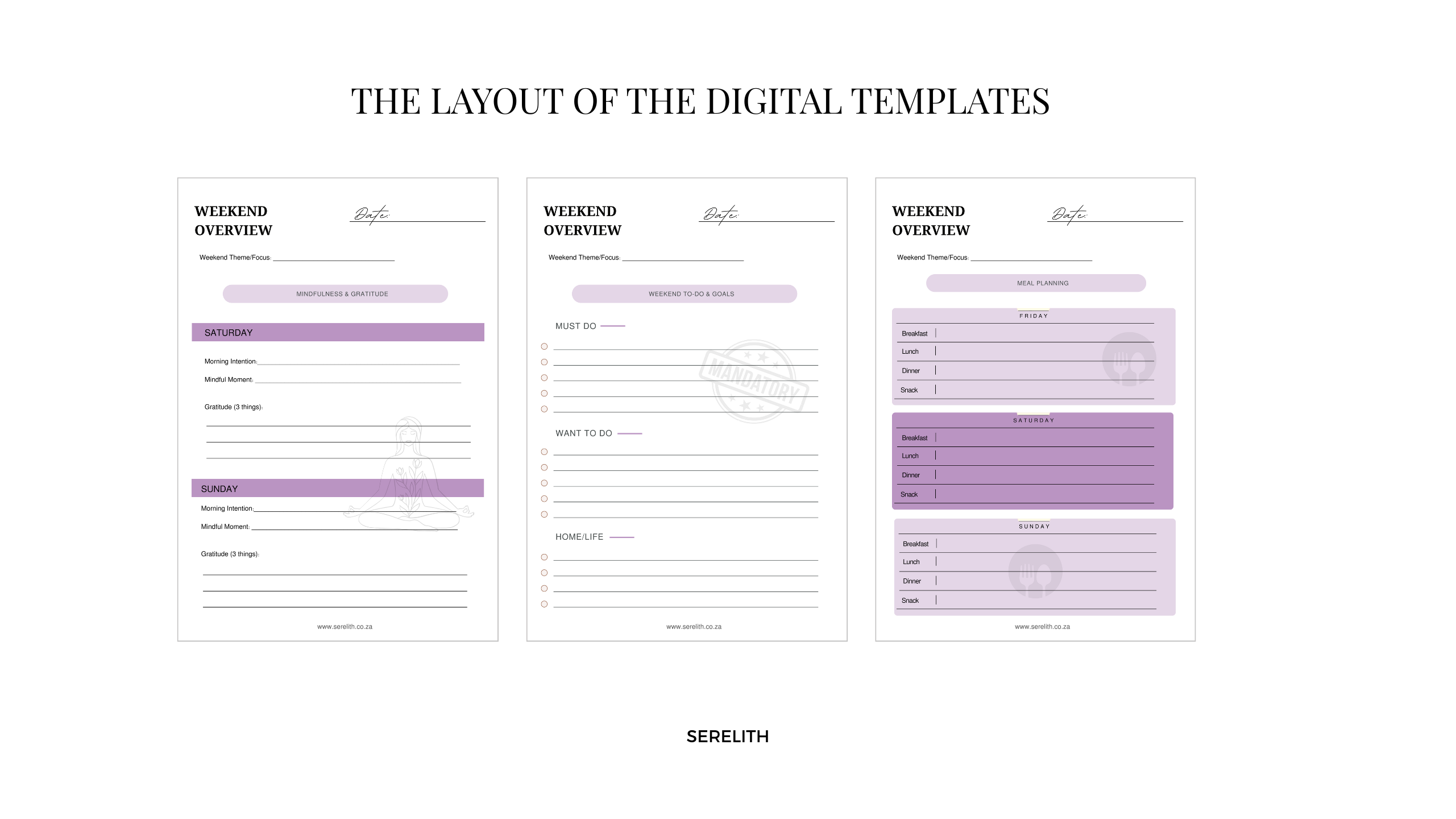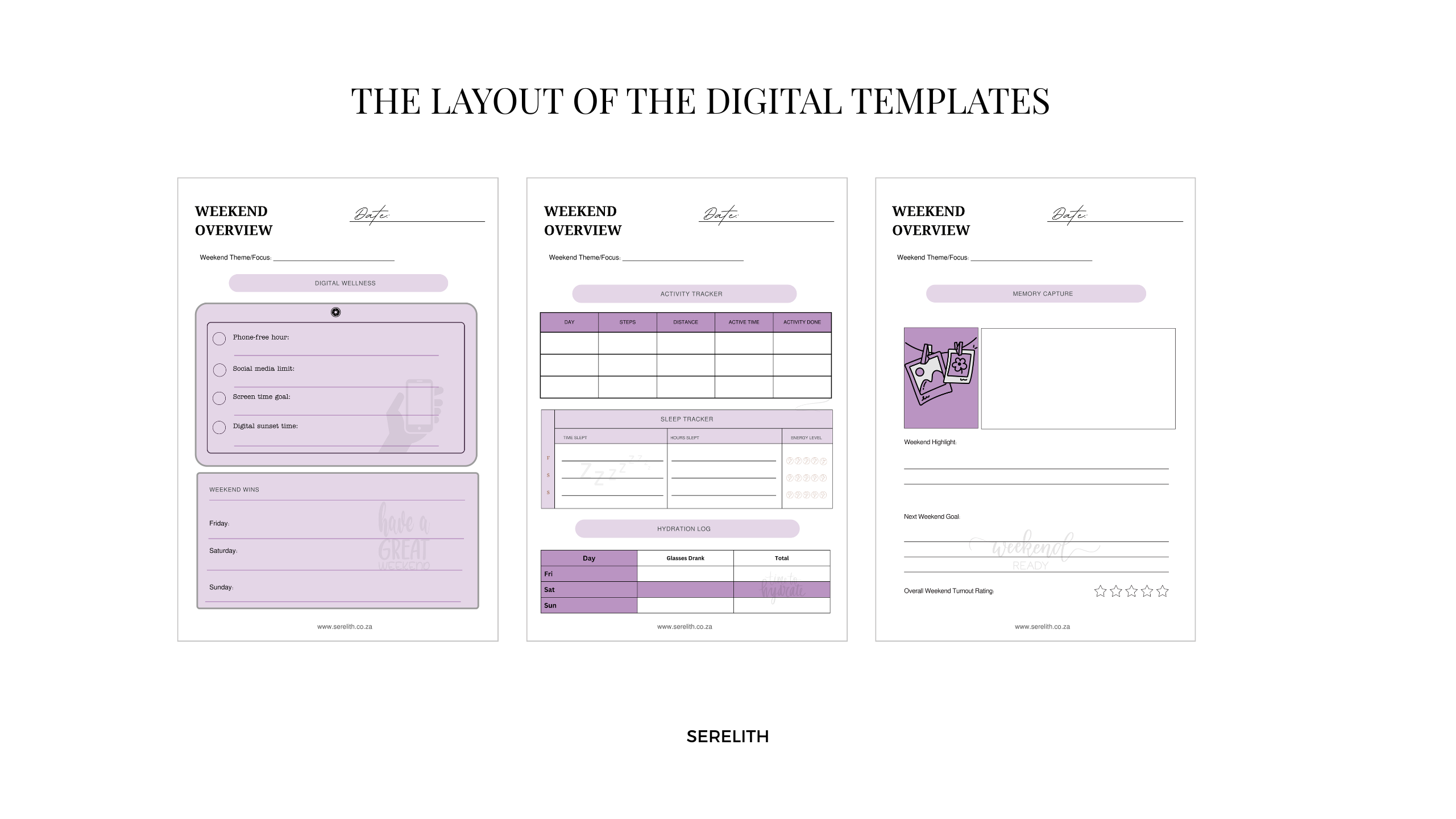 Reclaim your rest with the Serelith Wellness Weekend Overview Tracker. Spanning 122 pages, this specialized system helps you navigate the “Digital Sunset” with dedicated logs for screen-time boundaries, phone-free hours, and gratitude. Transform your weekends from “time lost” into a curated sanctuary of restoration.